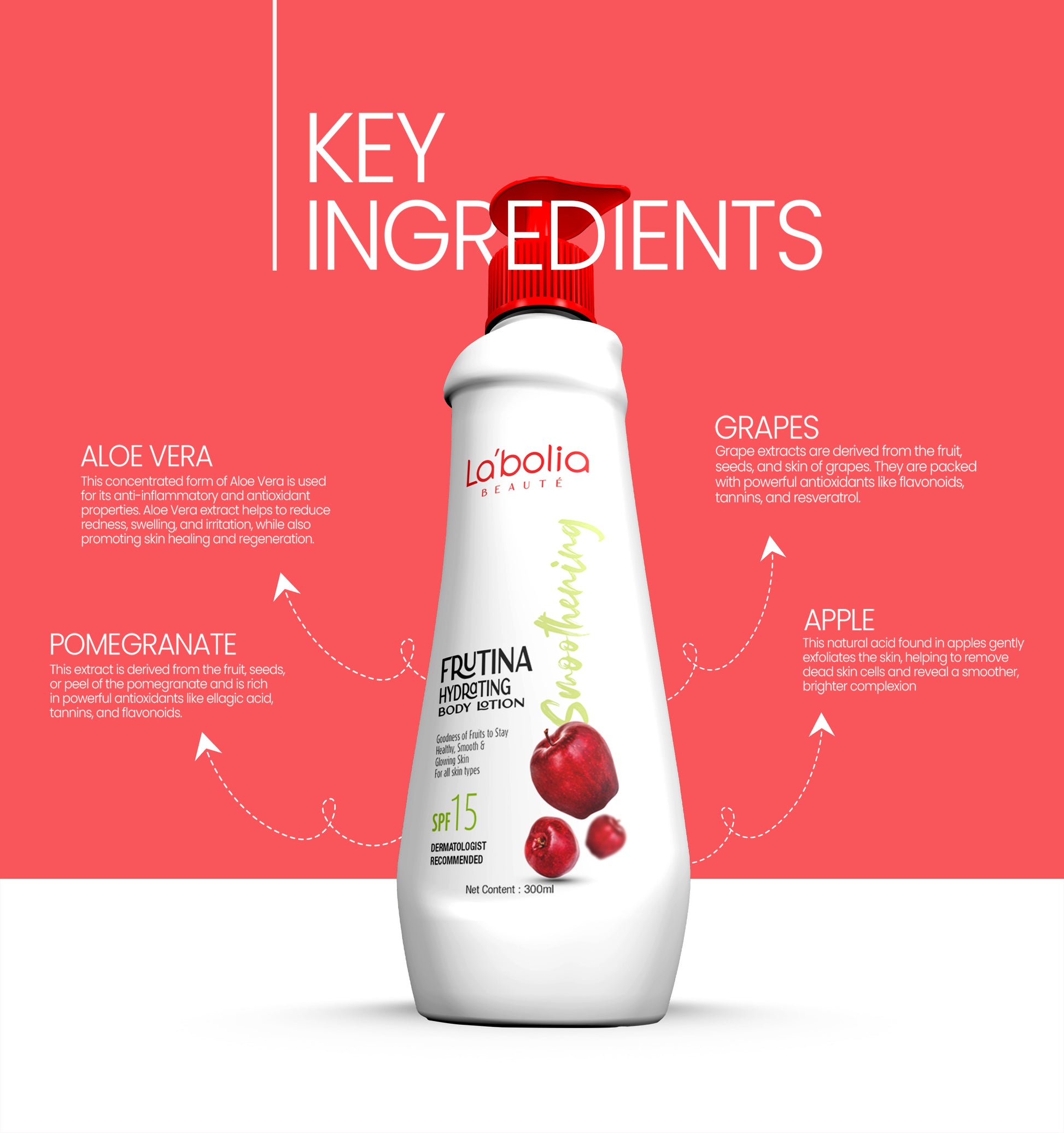 Labolia Beaute Frutina Body Lotion is enriched with the goodness of herbal extracts of fruits and vitamin e acetates. It gives a smooth and supple skin. It is a non greasy and fast absorbing lotion. It helps to maintain the moisture in the skin for a longer duration.