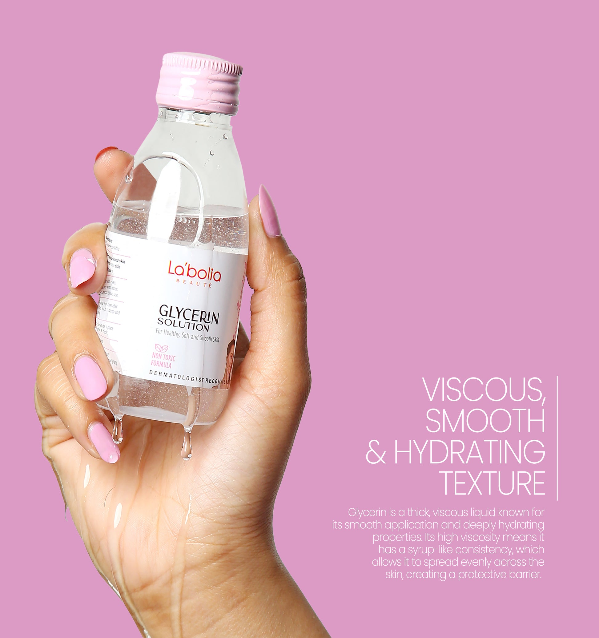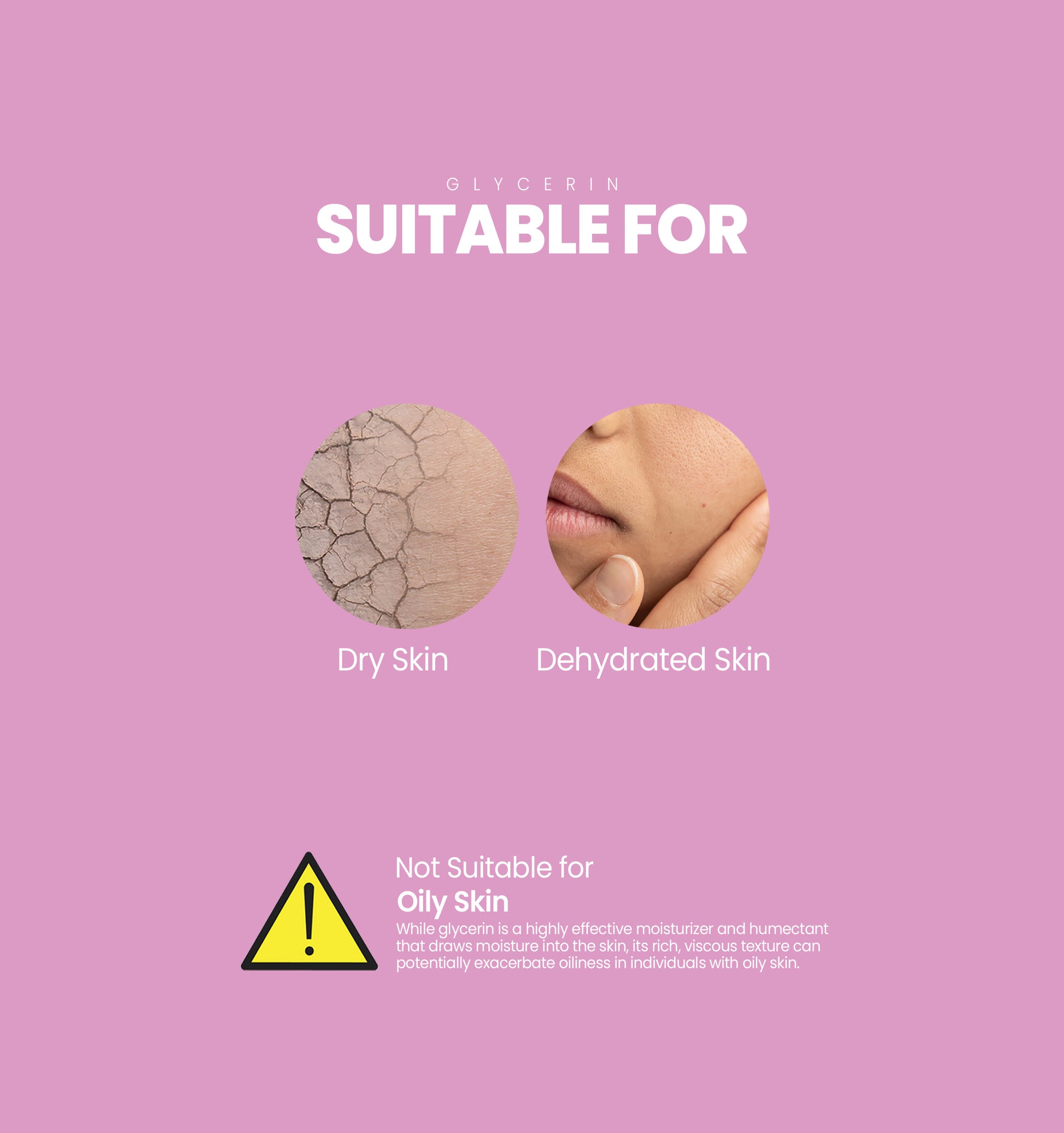 Glycerin not only helps to provide extra nourishment and hydration to the skin but also helps to retain the skin's moisture content for longer periods. It forms an extra layer of oil on the skin to prevent moisture loss from its surface. It is best suited for dry, flaky and dull skin. It helps in combatting visible signs of aging.