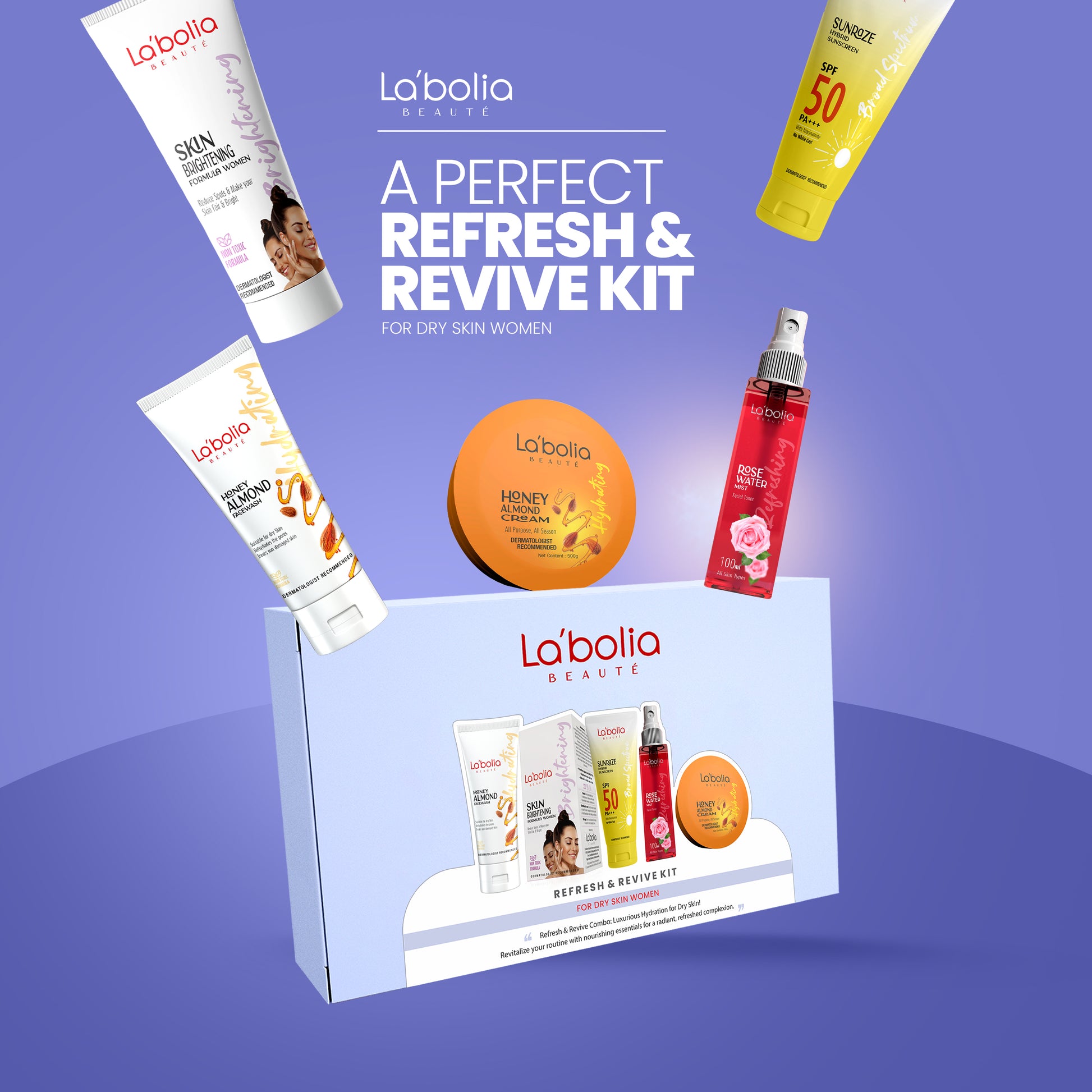 Introducing the Refresh & Revive Combo for Dry Skin, a curated collection from Labolia Beaute designed to rejuvenate and hydrate your skin. This set offers a complete ritual to address dryness and restore a radiant glow, ensuring your skin feels refreshed, revitalized, and protected. Perfect for women with dry skin, this combo combines the soothing and nourishing benefits of natural ingredients to enhance your skincare routine.
