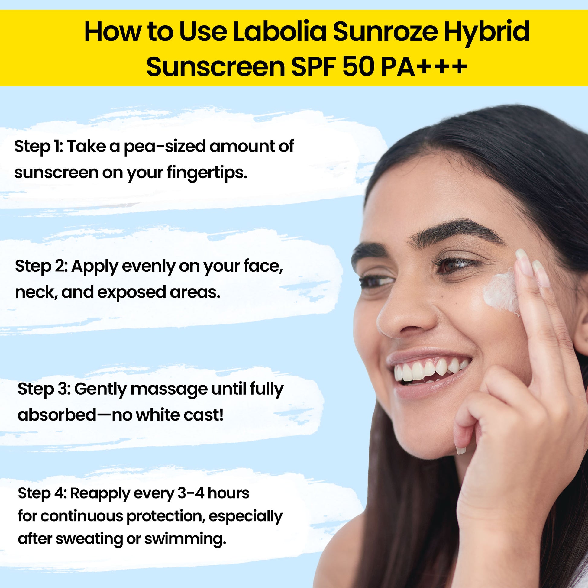 Use the three-finger rule while applying SPF. Reapply after 3 hours. Re-apply every hour if swimming